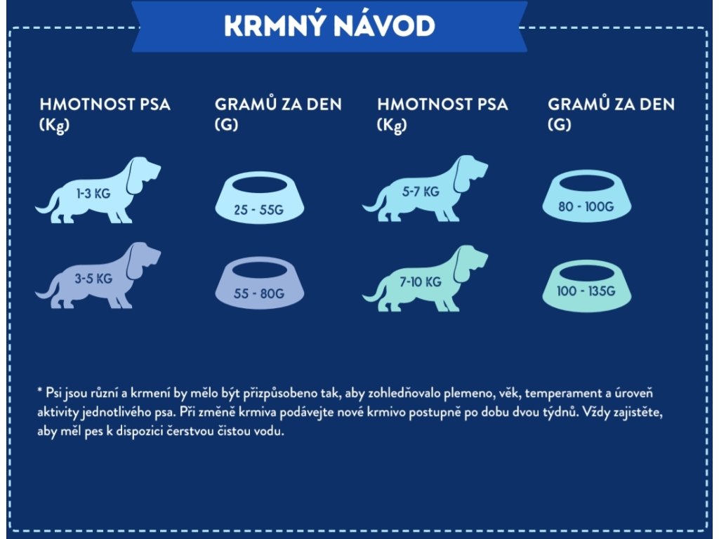 VITAMÍNY:Vitamin A 14,423 IU, Vitamin D3 2,000 IU,Vitamin E 96 IUKrmný návodHMOTNOST PSA(Kg)GRAMŮ ZA DEN(G)HMOTNOST PSA(Kg)GRAMŮ ZA DEN(G)STOPOVÉ PRVKY:Zinek (monohydrát síranu zinečnatého) 83 mg,Železo (monohydrát síranu železnatého) 48 mg,Mangan (monohydrát síranu manganatého) 34 mg,Měď (pentahydrát síranu měďnatého) 14 mg,Jód (bezvodý jodičnan vápenatý a jodid draselný) 1.7 mg,Selen (Seleničitan sodný) 0.38 mg