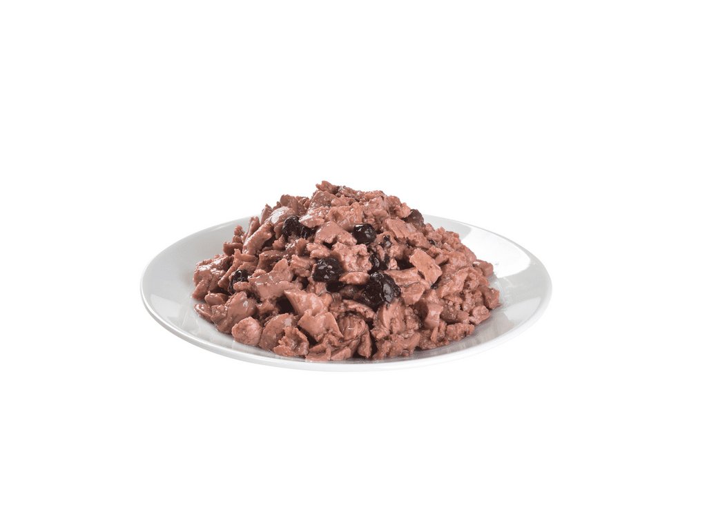 Složení: 45% ryby a výrobky rybího původu ve filetech (4% losos, 4% sleď), 9,6% masová šťáva, 1,5% byliny a ovoce (hřebíček, citrusy, rozmarýn, kurkuma), 0,5% borůvky, 1% minerály, 1% lososový olej, 0,5% mannan-oligosacharidy, 0.5% frukto-oligosacharidy, 0,4% inulin.