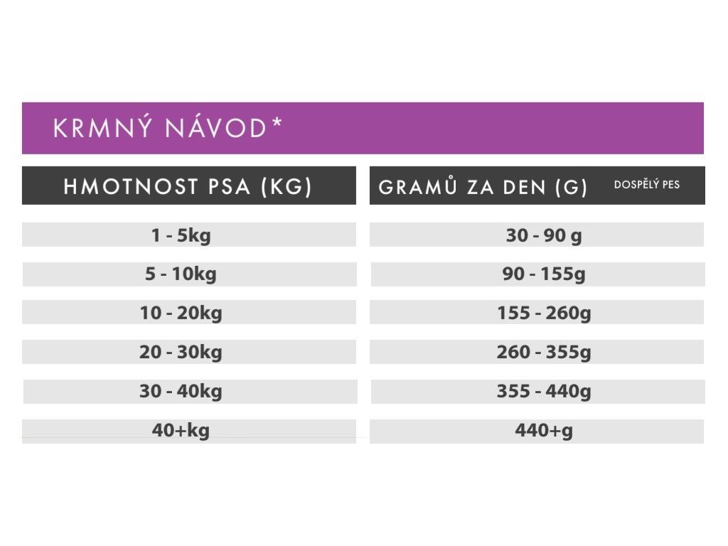 - ANALYTICKÉ SLOŽKY: Hrubý protein.................26,5%Hrubý tuk. . . . . . . . . . . . . . . . . . . . . . 11 %Hrubá vláknina................5%Hrubý popel...................9,5%Vlhkost..........................8%NFE (bezdusíkatý extrakt)....40%Metabolizovatelná energie ME.. 339 kcal/100gOmega 6 mastné kyseliny....1,8%Omega 3 mastné kyseliny....1,7%Vápník...........................1,7%Fosfor............................1,5%