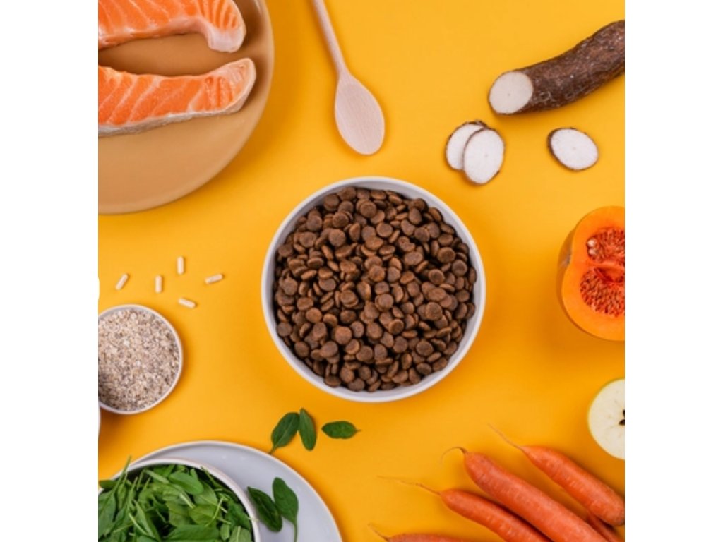 Na této receptuře jsme dlouho pracovali. Granule pro štěňata by měly být snadno stravitelné, rozkousatelné a jejich složení musí podporovat zdravý vývin a růst štěňátka. Sáhli jsme proto po lehkém, ale zároveň maximálně výživném lososovi, nastrouhali dýni a přidali i hrášek, který jsme zbavili slupek. Všechno jsme uvařili šetrně na páře a přidali prospěšná probiotika. Obloukem jsme se přitom vyhnuli obilovinám a jiným levným plnidlům.