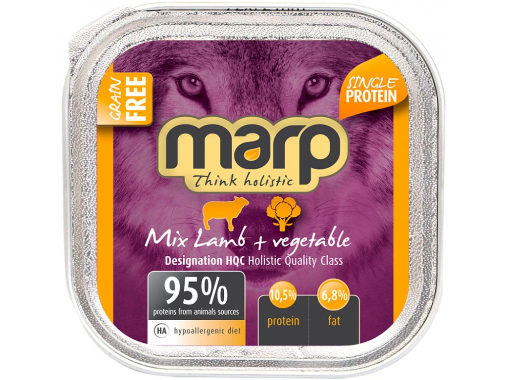 Víme, že pes je masožravec a proto ho jako takového ctíme. Vaničky Marp Mix obsahují 95% bílkovin ze živočišných zdrojů. Obsahují pouze maso, vnitřnosti, zeleninu, vývar a minerály. Nepoužíváme žádné umělé konzervanty, barviva, plnidla apod. a jsou vždy bez jakýchkoliv obilovin. Vanička Marp Mix s jehněčím bez obilovin je vhodná pro psy s citlivým zažíváním a dle našich zkušeností je velmi vhodná i pro psy s potravními alergiemi.